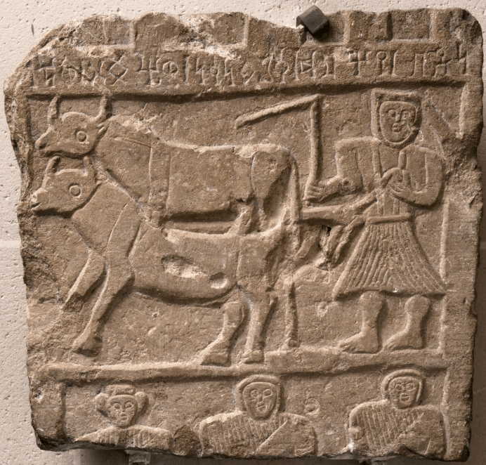 نقش حميري بارز مع مشهد عمل؛ حجر. اليمن، القرن الثاني ق.م.
