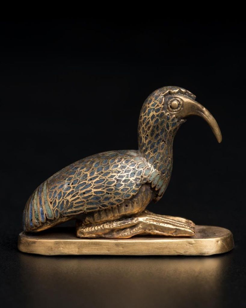 An ibis upon an oblong gold plinth, with feathers represented by blue copper enamel.