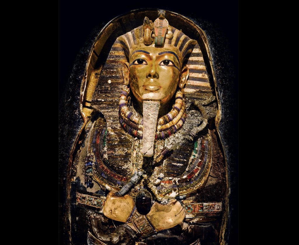 This photograph captures the early moments after Howard Carter opened King Tutankhamun’s solid gold coffin.