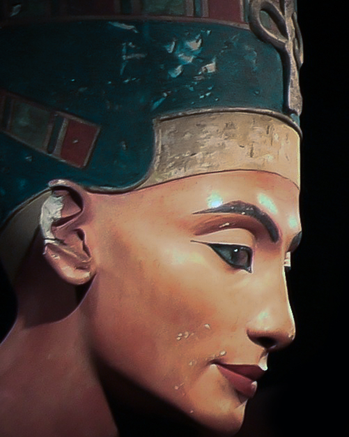 A painted limestone bust of Nefertiti of 19 in. tall & 20 kg (44lbs) in weight. New Kingdom, 18th Dynasty, Amarna Period, c. 1345 B.C. Neues Museum, Berlin, Germany. ÄM 21300. Photograph by Francesco Zenaro. More.