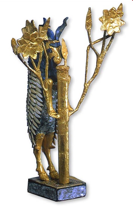 Ram Caught in a Thicket; Gold, silver, lapis lazuli, copper, shell, red limestone, and bitumen. Height: 42.6 cm. PG 1237, the “Great Death Pit”; 30-12-702 (U.12357). Ur, ca. 2650–2550 B.C.