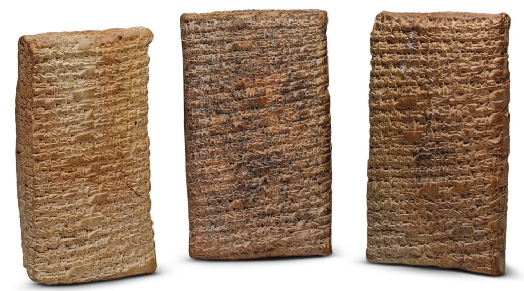 Tablets inscribed with “The Exaltation of Inanna” in three parts, possibly Larsa (modern Tell Senkereh). Old Babylonian period, ca. 1750 BC.