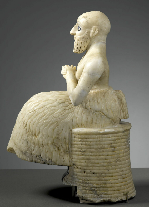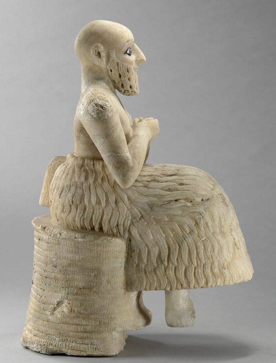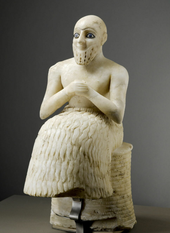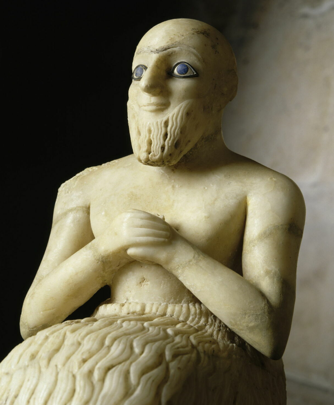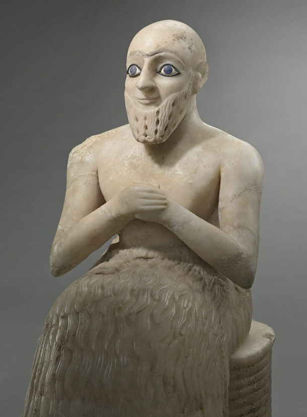 Inscribed statue of steward Ebih-Il praying with joined hands, shaved head, bearded and wearing a kaunakes-type skirt. He is seated on a wickerwork stool; the eyes are treated with inlays as the eyebrows and beard must have been.